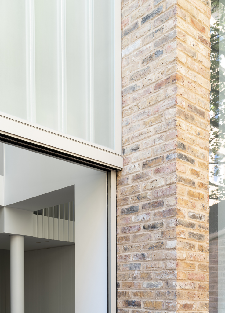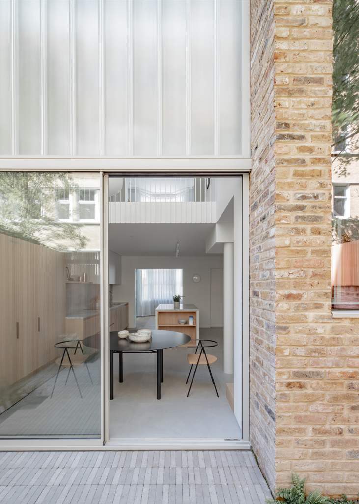 The property is located on the north side of Minford Gardens in the London borough of Hammersmith and Fulham. It is a three-story Victorian terraced house with a private north-facing garden. The new extension is situated at the rear of the building, overlooking a small garden. Brick was used to match the original rear elevations. This rear façade of the extension is protruding and stands out from the original brick façade with a large glazed area. The new glazing features a partially translucent layer in front of a double-height room and living spaces, allowing light to enter while shielding the interior spaces from external views. Towards the garden, the metal-framed sliding door provides access, natural ventilation, and a view of the green spaces.