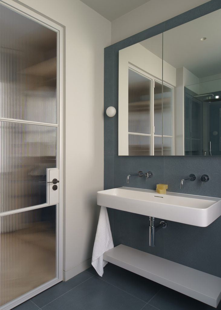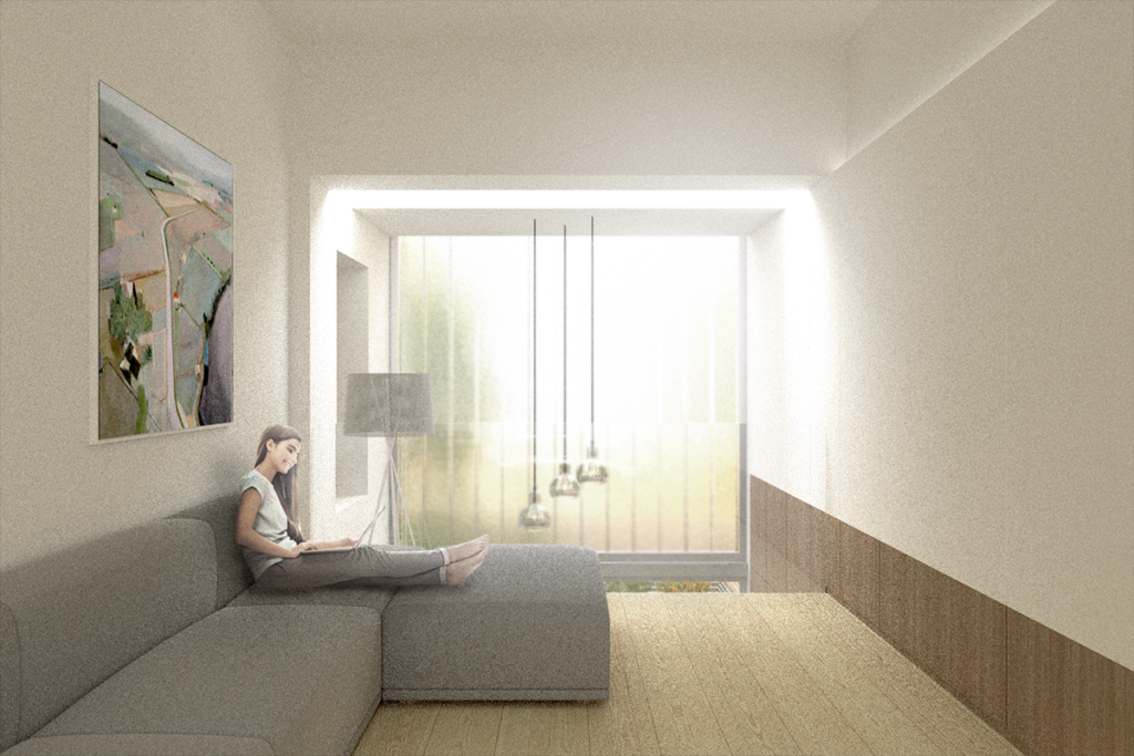 The new glazing features a partially translucent layer in front of a double-height room and living spaces, allowing light to enter while shielding the interior spaces from external views.